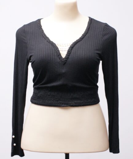 [G/GG] Cropped canelado manga longa com detalhes de pérolas
